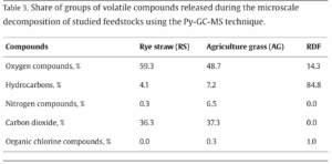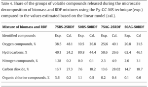 For RS and AG as seen in the table above, the main group of compounds were oxygen compounds. Meanwhile, for RDF, hydrocarbons were the dominant volatile products, and the very low oxygen content for RDF (<2.85 weight%) resulted in a negligible CO2 content, unlike the biomass samples. For the four mixtures of biomass and RDF (75RS-25RDF, 75AG-25RDF, 50RS-50RDF, and 50AG-50RDF), the percentages of the groups of volatile compounds released were compared to the values estimated based on the linear model.