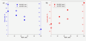 The yields of the bio-char and bio-oil phases are presented in Figure 5 above. The char yield for AG was higher (27.3%) than for RS (21.2%). The addition of 50% RDF to biomass decreased the char yields to 16.2% and 13.2%, respectively. Bio-oil yield was higher for RS (35.9%) than for AG (29.9%). Results from previous studies also show higher bio-oil yields and lower bio-char yieldsas RDF percentage increased. As predicted, co-pyrolysis of RDF with biomass gave a better synergetic effect for RS than for AG with the RS samples producing a higher ratio of bio-oil than the AG samples.The gas yield was calculated by the formula, 100% – char yield – liquid yield, and the pure RS and AG samples had similar gas yields at around 40%. The presence of RDF did not significantly influence gas yield for AG, but for RS (50RS-50RDF) decreased the yield by 13%. Gas yields consisted mainly of CO, CO2, H2, and CH4. The calorific value of gas from RS pyrolysis was higher than for AG. The addition of RDF for both biomasses (50RS-50RDF and 50AG-50RDF) decreased the content of CO and H2 and simultaneously increased the amount of CO2 and CH4 product. However, the study mentions that the gas yields from co-pyrolysis were not a concern, as the main goal was to obtain bio-oil.