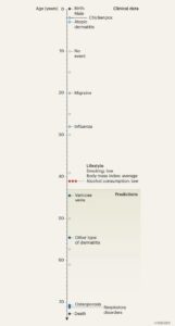 Delphi-2M is an AI model trained on over 400,000 patient histories from a UK database to forecast an individual’s 20-year disease trajectory. Similar to chatbots like ChatGPT, Delphi-2M is a large language model (LLM), a type of AI that can recognize and reproduce patterns from large amounts of data. Similar to how chatbots pick up on what words are likely to appear with other words in order to form sentences, Delphi-2M learns from its vast training set of medical records to predict a patient’s disease trajectory from realworld patterns. As Yonghui Wu puts it in her summary of Shmatko et al.’s work, it’s just how becoming a smoker may be followed by a future diagnosis of lung cancer—these are patterns Delphi-2M recognize. To do this, Delphi-2M is fed “tokens” that link diseases or health factors to specific times in a person’s life, like chickenpox at age 2 or smoking at age 41 (Figure 1). Then, Delphi-2M outputs new tokens that predict what diseases and when they will occur in an individual’s life, like the onset of respiratory disorders at age 71 as a result of smoking. Delphi-2M, after being trained, was tested by predicting the medical histories of 1.9 million patients not included in the original training set. Shmatko et al. demonstrate this AI to have great success in accurately predicting disease trajectory, as it partially predicts patterns in individuals’ diagnoses in 97% of cases.