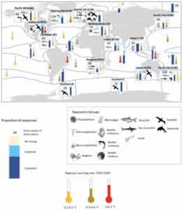Fig 1. Global distribution of documented marine biological responses to climate change across major ocean regions (Poloczanska et al., 2016). Bars show the proportion of observed responses as consistent (dark blue), equivocal (light blue), or no change (yellow). Numbers indicate total observations per region; symbols identify taxa with ≥10 observations. Background colors represent regional sea-surface warming from 1950–2009 (yellow: low; orange: medium; red: high). Regions are defined by ecological structure and oceanographic features. eveal that climate-driven shifts in abundance, distribution, and phenology vary sharply across ocean basins—mirroring the uneven adaptive capacities described by Huertas et al. (2011).